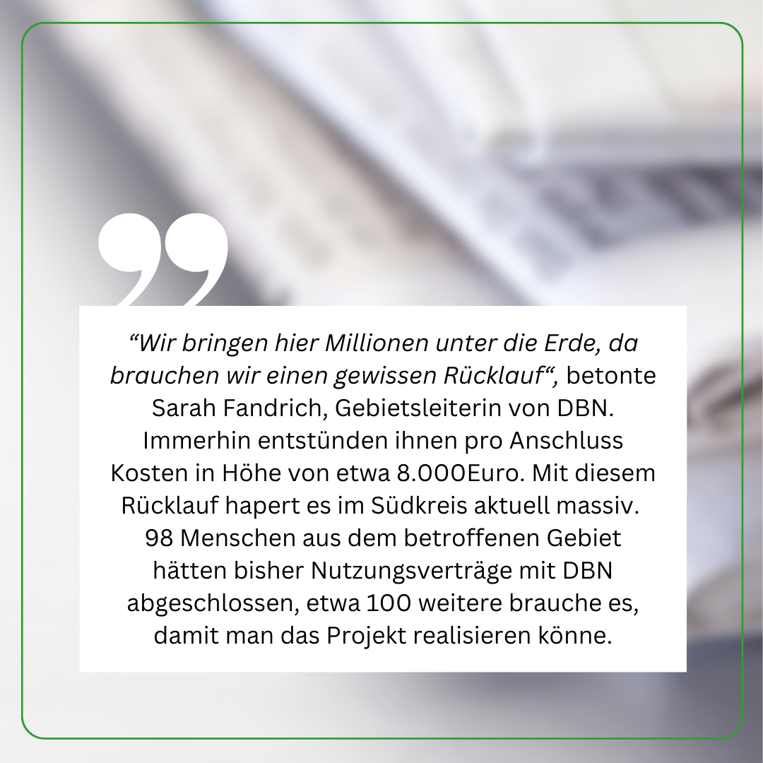 Wir haben nicht nur viele Fragen beantwortet, sondern auch deutlich gemacht, wie wichtig der Glasfaserausbau für die Zukunft der Region ist. Der aktuelle Stand: Über 400 Verträge sind bereits eingegangen – ein starkes Signal, aber ein paar fehlen noch bis zur Zielmarke.